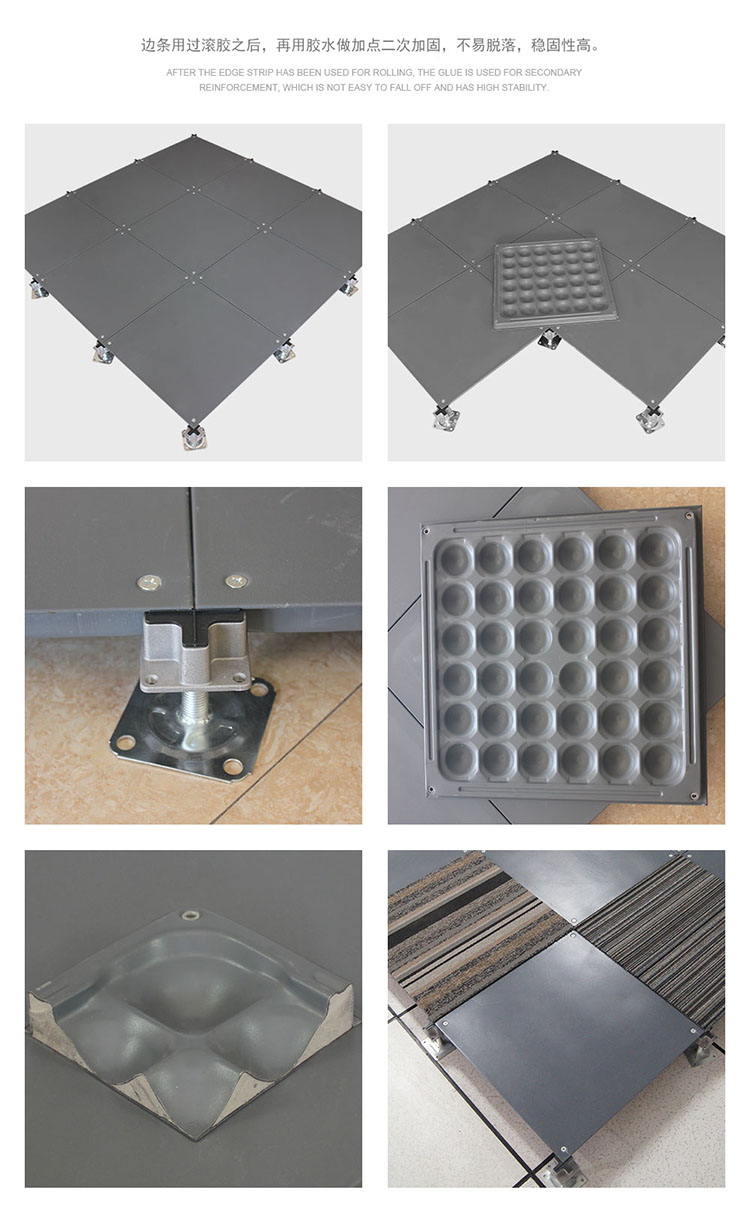 該地板可以選配帶出線口的配置,可根據(jù)要求任意添加線槽布線更具靈活性。此地板可以將強、弱電分開隔離,同時也便于檢修。安裝采用無梁角鎖,具有牢靠、穩(wěn)定、調(diào)平、簡便之特點。